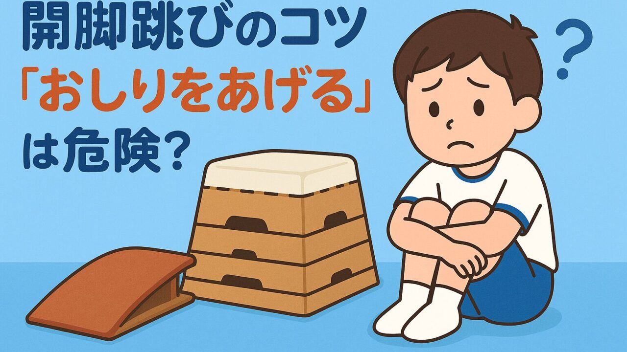 跳び箱の開脚とびについて、「おしりをあげる」が危険な理由をあげ、コツと練習法について解説しました。